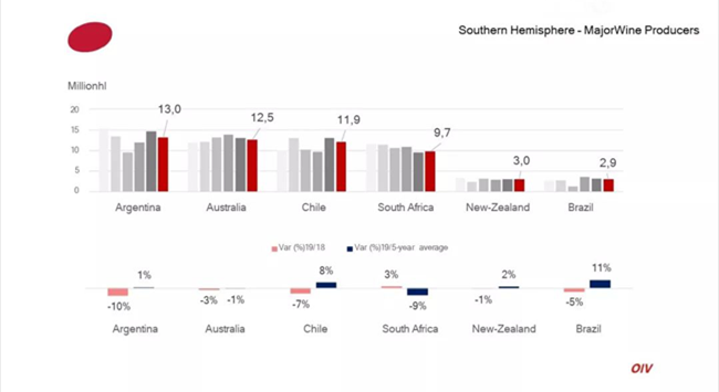 南半球2019年葡萄酒產(chǎn)量為54億升(mhl),占據(jù)全球葡萄酒產(chǎn)量的20%,與2008-2018年平均產(chǎn)量持平。