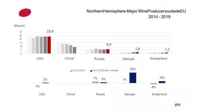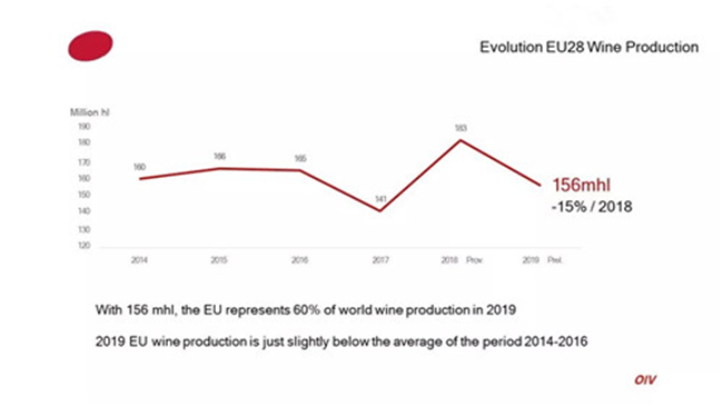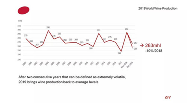 據(jù)國(guó)際葡萄與葡萄酒組織(OIV)最新數(shù)據(jù)顯示,2019年全球葡萄酒產(chǎn)量為263億升(mhl),同比2018年下降了10.54%。