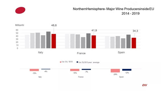 包括法國(guó)、意大利、西班牙在內(nèi)的葡萄酒主產(chǎn)國(guó)產(chǎn)量均有不同程度下降。OIV的數(shù)據(jù)來自28個(gè)國(guó)家,占全球葡萄酒產(chǎn)量的85%。