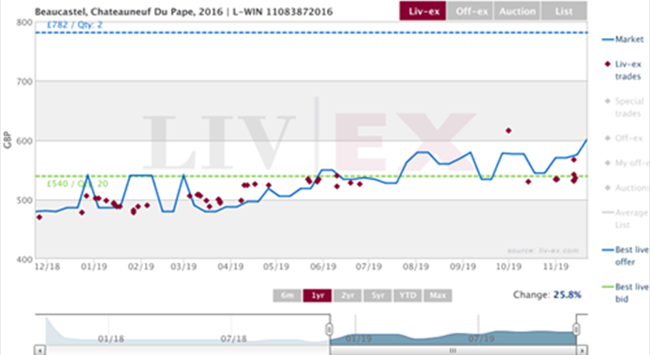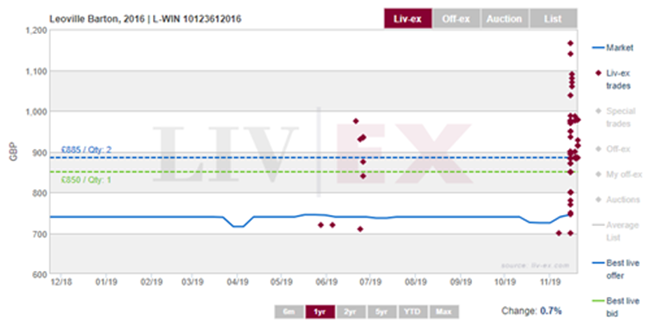 上周五,自巴頓Leoville Barton 2016年被Wine Spectator評為2019年度最佳葡萄酒后,此酒隨即出現一陣熱買和價格上漲。在幾個小時內,它的成交價更創歷史新高,高達1,166英鎊 (每箱12×75) 。