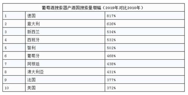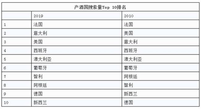 數(shù)據(jù)顯示,2019年在葡萄酒搜索器搜索量排名前十位的葡萄酒產(chǎn)酒國分別為法國、意大利、美國、西班牙、澳大利亞、葡萄牙、智利、阿根廷、德國與新西蘭。這份榜單的排位與2010年有些許不同。在2010年,美國在意大利之前,阿根廷則排列在智利之前,新西蘭在德國前面。