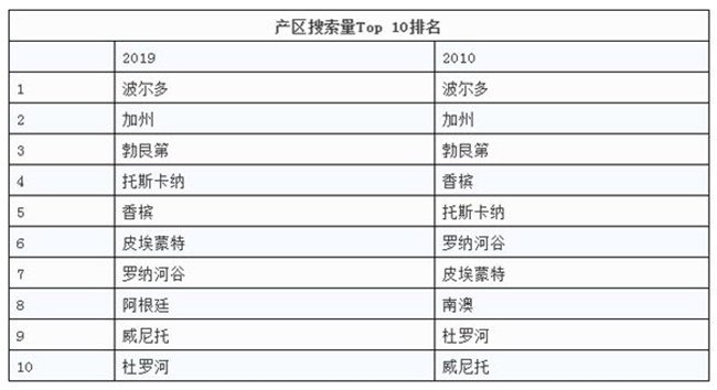 在2010年,以產(chǎn)區(qū)劃分搜索次數(shù)最多的依次為波爾多、加州、勃艮第、香檳、托斯卡納、羅納河谷、皮埃蒙特、南澳、杜羅河、威尼托。2019年,托斯卡納超越了香檳,皮埃蒙特超越了羅納河谷,威尼托超越了杜羅河。