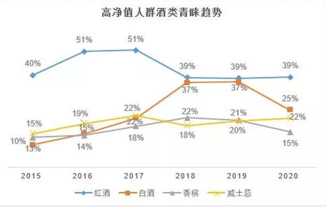 實際上,葡萄酒已越來越成為中國消費者喜愛的酒精飲料。據胡潤研究院發布《2020胡潤至尚優品—中國千萬富豪品牌傾向報告》顯示,中國高凈值人群(平均家庭總資產4600萬元)最青睞酒類是紅酒,對葡萄酒的喜愛甚至超過白酒。