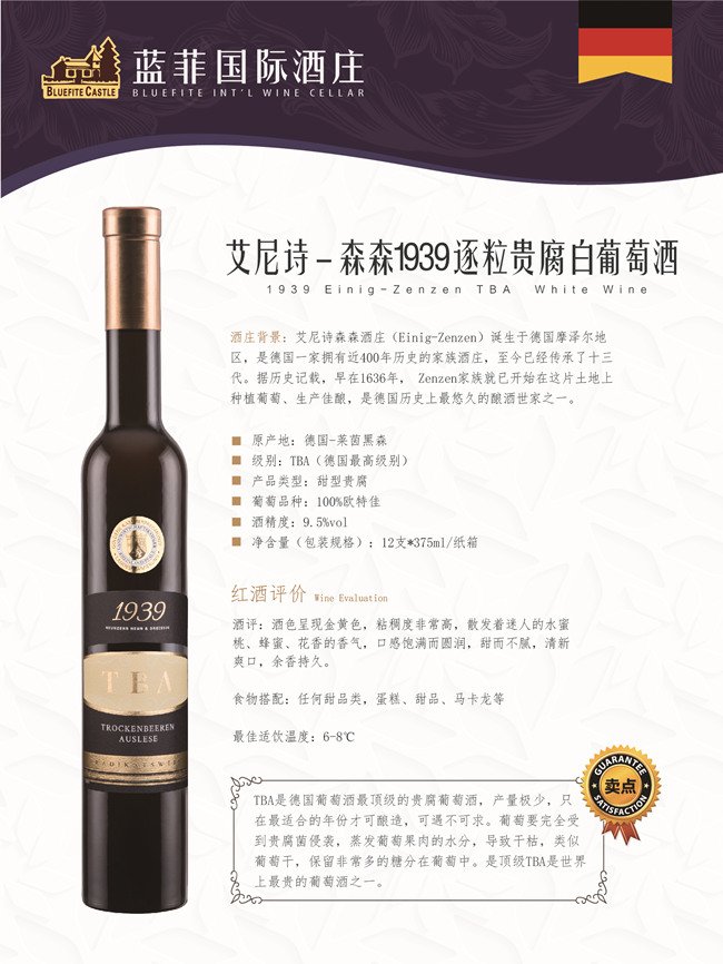 艾尼詩-森森1939逐粒貴腐白葡萄酒的級別是Qmp-TBA(逐粒精選葡萄干),TBA是德國葡萄酒最頂級的貴腐葡萄酒,產量極少,只在最適合的年份才可釀造,可遇不可求。尼詩-森森1939逐粒貴腐白葡萄酒對于葡萄的要求特別高,葡萄要完全受到貴腐菌侵襲,蒸發葡萄果肉的水分,導致干枯,類似葡萄干,從而保留非常多的糖分在葡萄中。而頂級TBA是世界上最貴的葡萄酒之一。