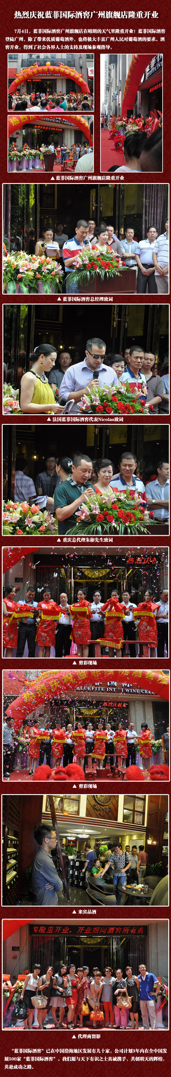 7月4日,藍(lán)菲國(guó)際酒窖廣州旗艦店在晴朗的天氣里隆重開業(yè)!藍(lán)菲國(guó)際酒窖登陸廣州,除了帶來(lái)優(yōu)質(zhì)葡萄酒外,也將極大豐富廣州人民對(duì)葡萄酒的要求。酒窖開業(yè),得到了社會(huì)各界人士的支持及現(xiàn)場(chǎng)參觀指導(dǎo)。